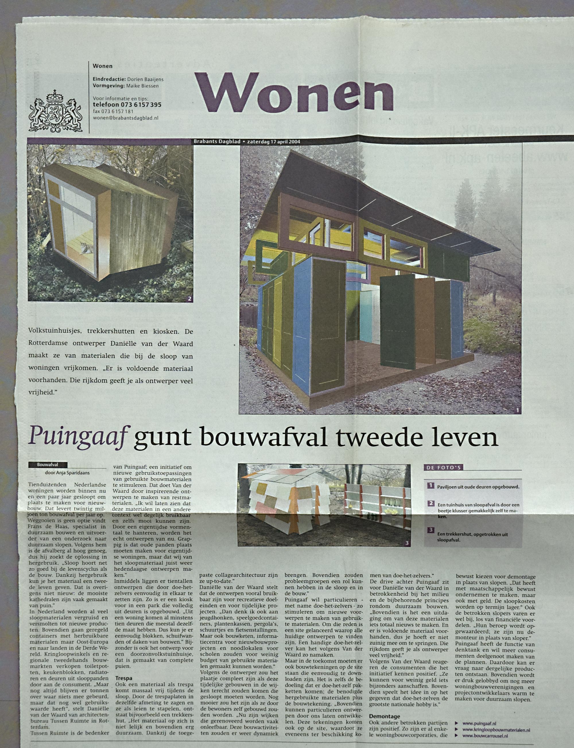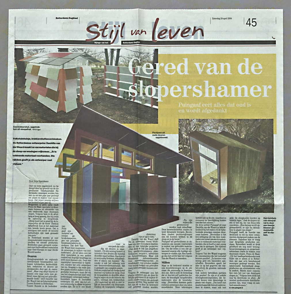 Sinds 2001 onderzoekt Puingaaf de mogelijkheden om vrijkomend sloopmateriaal uit o.a. de duurzaam en selectief slopen experimenten te hergebruiken. Puingaaf maakte haar start met initiatiefneemsters Lidewij Tummers en Danielle van der Waard in 2001. Danielle ontwikkelt ontwerp-strategien en bovenstaande voorbeelden die als inspiratie kunnen dienen voor opdrachtgevers en zelfbouwers. Het concept kreeg uitgebreid aandacht in de pers maar het bleek lastig stakeholders te vinden om de cyclus rond te krijgen. Daarnaast trok het ook geïnteresseerden die dachten met hergebruik een goedkoper alternatief te vinden voor het prefab tuinhuis van de bouwmarkt om de hoek in Amsterdam-Zuid. Inmiddels is hergebruik in aanzien gestegen en zijn slimmere methoden ontwikkeld om van afval nieuwe grondstoffen te maken.